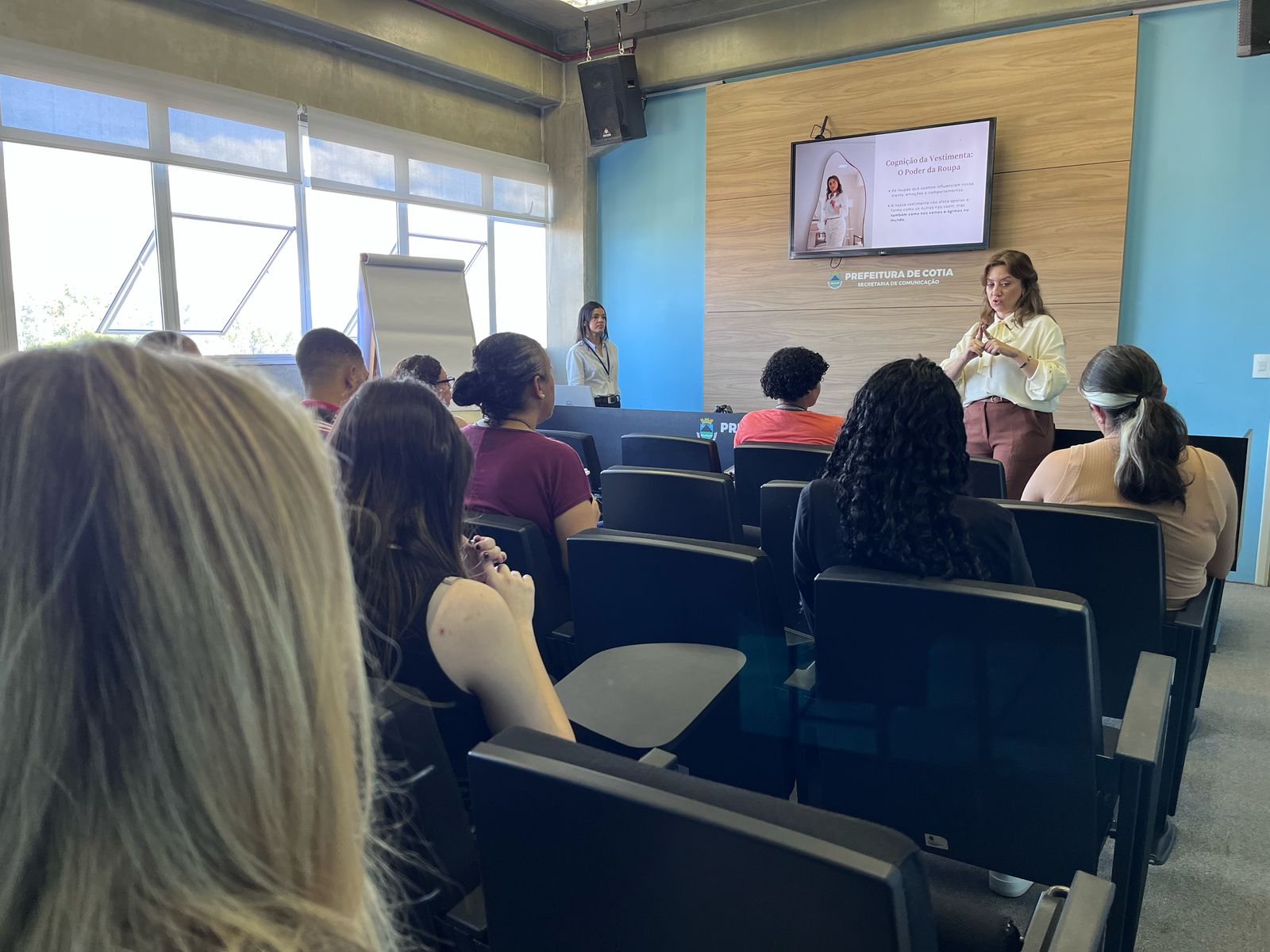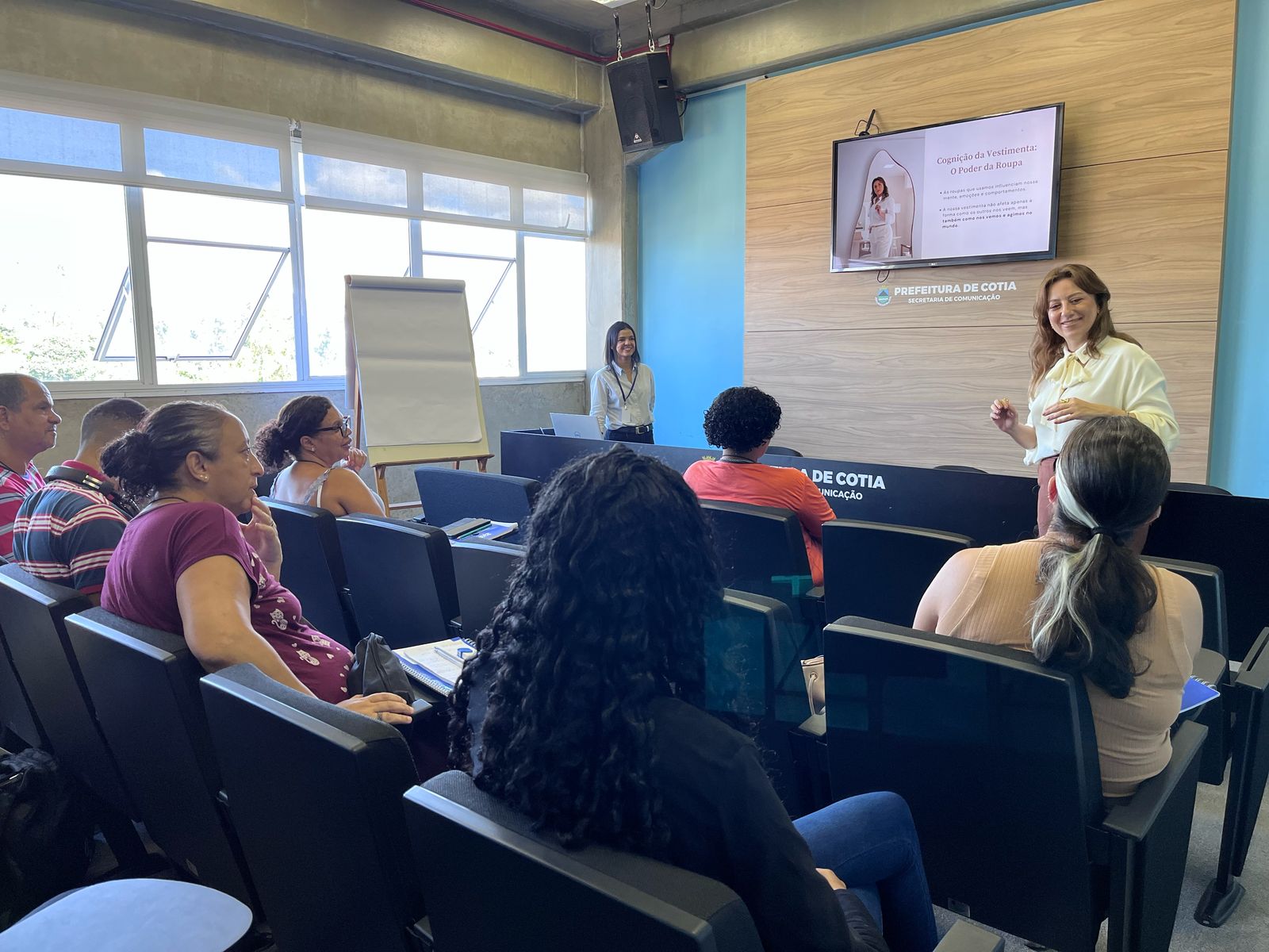 Os participantes do Programa ‘Meu Emprego – Trabalho em Equipe’, oferecido por meio de uma parceria entre a Secretaria Estadual de Desenvolvimento Econômico e a Secretaria de Trabalho e Renda de Cotia, acompanharam a palestra ‘Cognição da vestimenta – O poder da roupa’, ministrada pela comissária de bordo e consultora de imagens, Luciana Ximenes, na tarde dessa quarta-feira (30/04/2025).