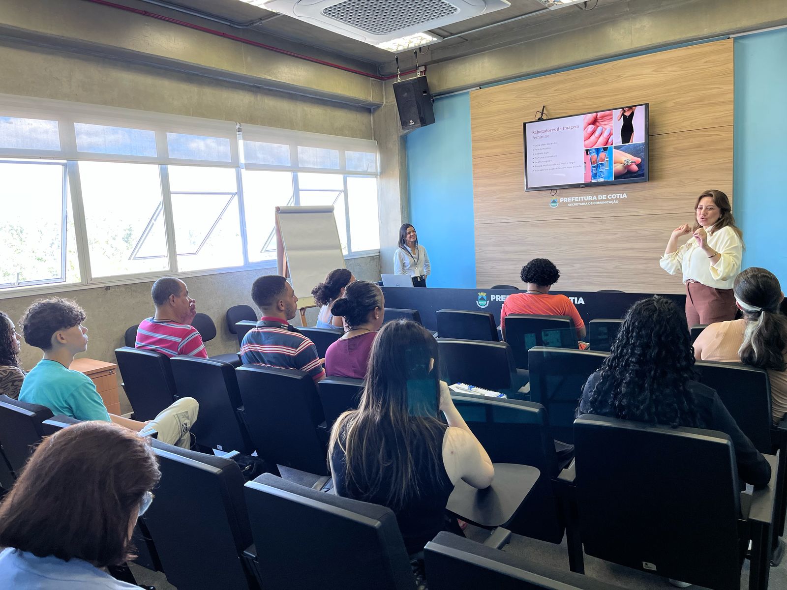 Orientações valiosas que podem aumentar as chances de sucesso ao ajudarem na construção de uma imagem pessoal positiva. A palestrante alertou sobre os sabotadores de imagens femininas e masculinas que devem ser evitados: unha com esmalte descascando, cabelo sujo, excesso de perfume, jeans rasgado, roupa muito justa ou muito larga, acessório quebrado ou em mau-estado, muitas partes do corpo à mostra, camisa de time ou com estampa, bermuda, camisas com apologias e ideologias, barba com fazer, boné, unhas sujas, cheiro de suor.