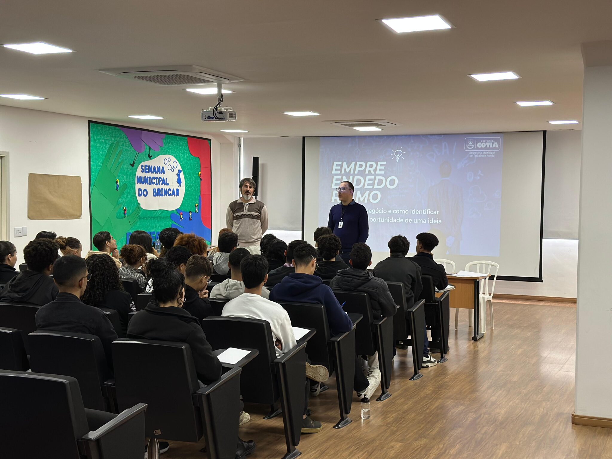 Os cem estagiários contratados pela Prefeitura de Cotia participaram de uma palestra sobre Empreendedorismo. Foram quatro horas de muito conteúdo ministrado pelo Secretário de Trabalho e Renda, Michel da Silva Alves, e por Eduardo Molina, MBA em Comércio Exterior, nesta quarta-feira (30/07/2025), no auditório da Secretaria de Educação. Os participantes fazem parte do Programa Bolsa Estágio Ensino Médio (BEEM).