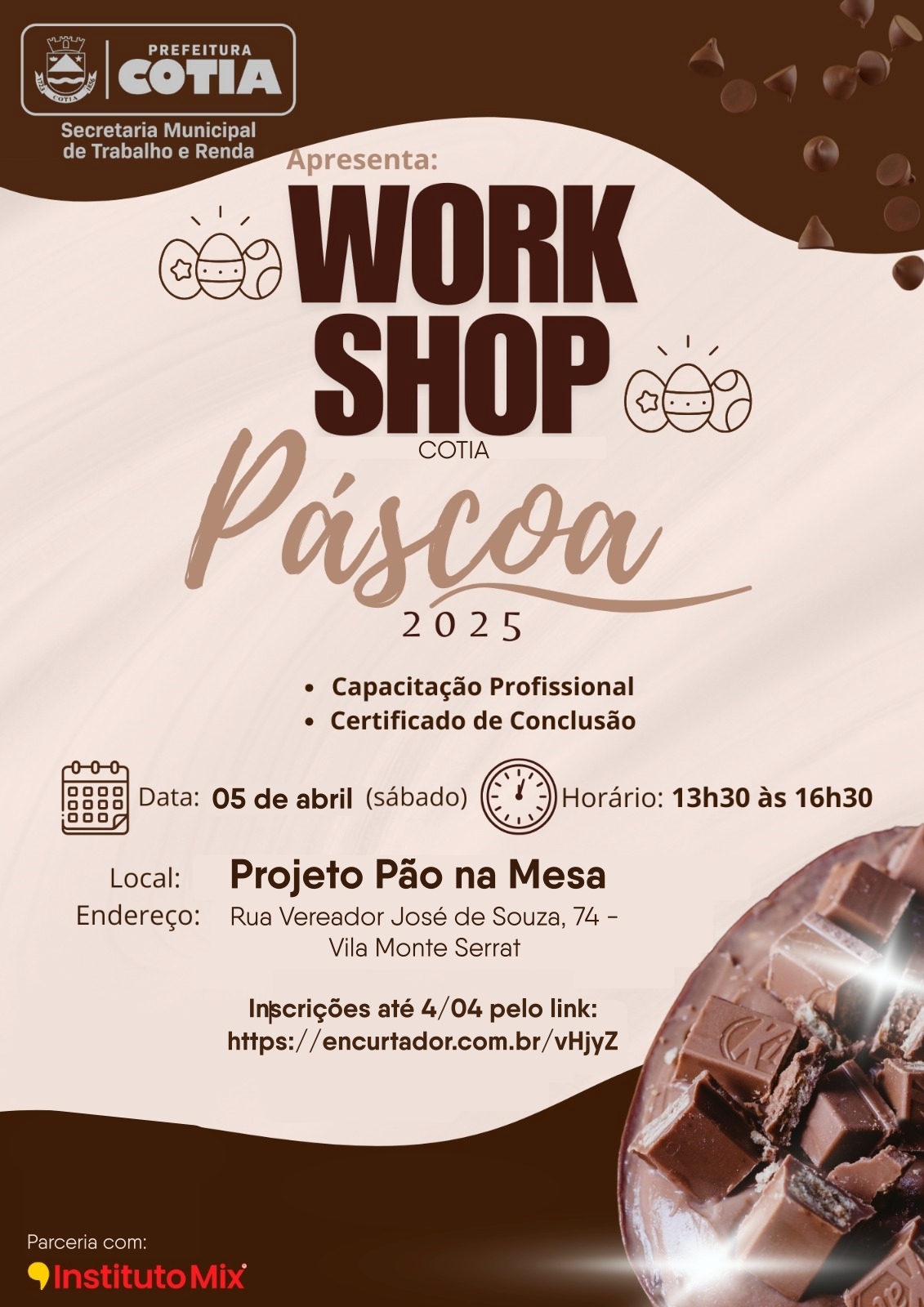 A Prefeitura de Cotia, por meio da Secretaria de Trabalho e Renda, está com inscrições abertas para o workshop ‘Páscoa’, que acontecerá em Caucaia do Alto (22 de março) e em Cotia (05 de abril). O curso terá duração de três horas e os participantes aprenderão a fazer ovos de chocolate. Os participantes aprenderão técnicas de confecção de ovos de chocolate, desenvolvendo habilidades práticas e conhecimentos que poderão abrir as portas para oportunidades profissionais. O workshop será oferecido em parceria com o Instituto Mix e com o apoio do Fundo Social de Cotia.